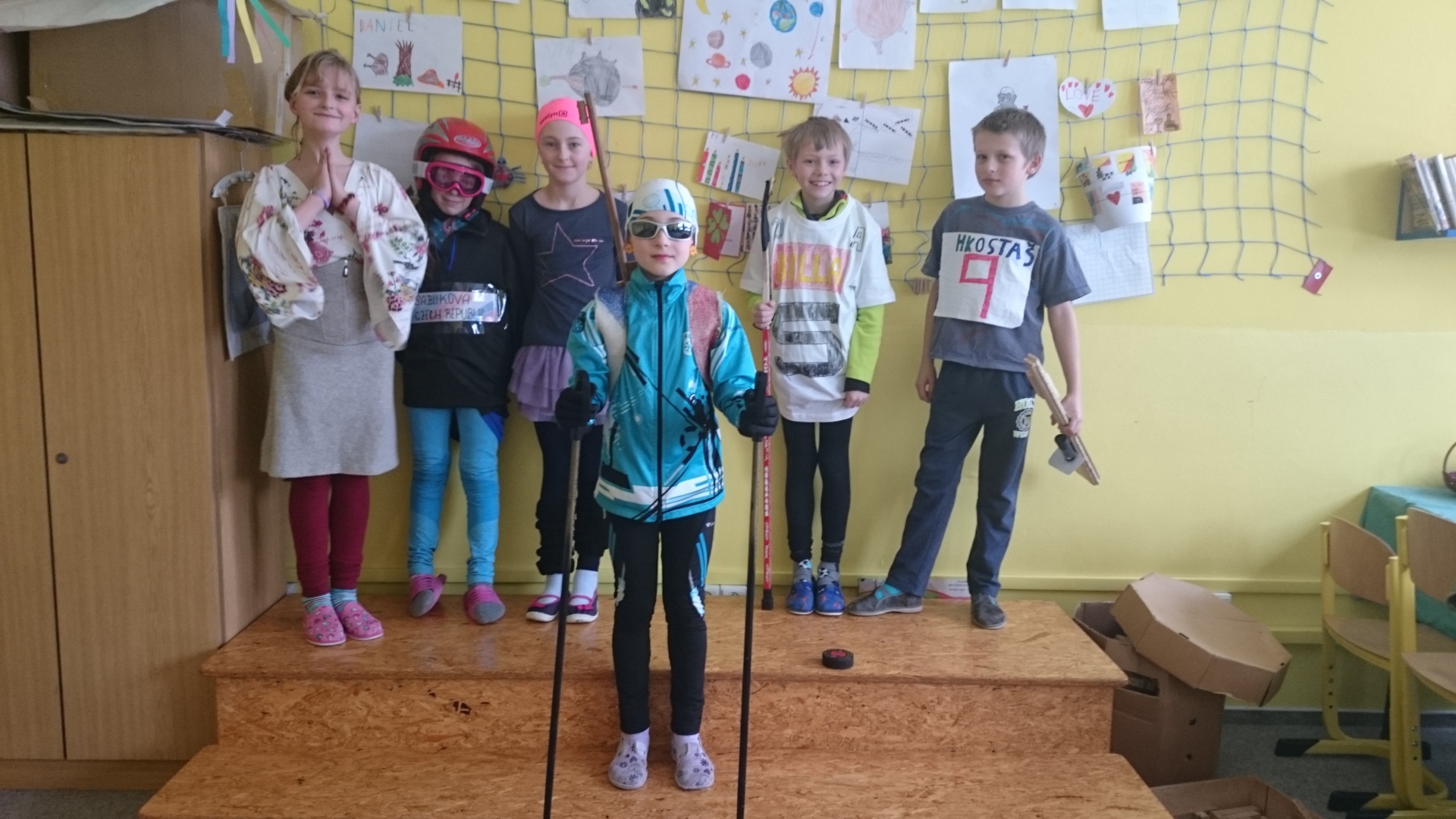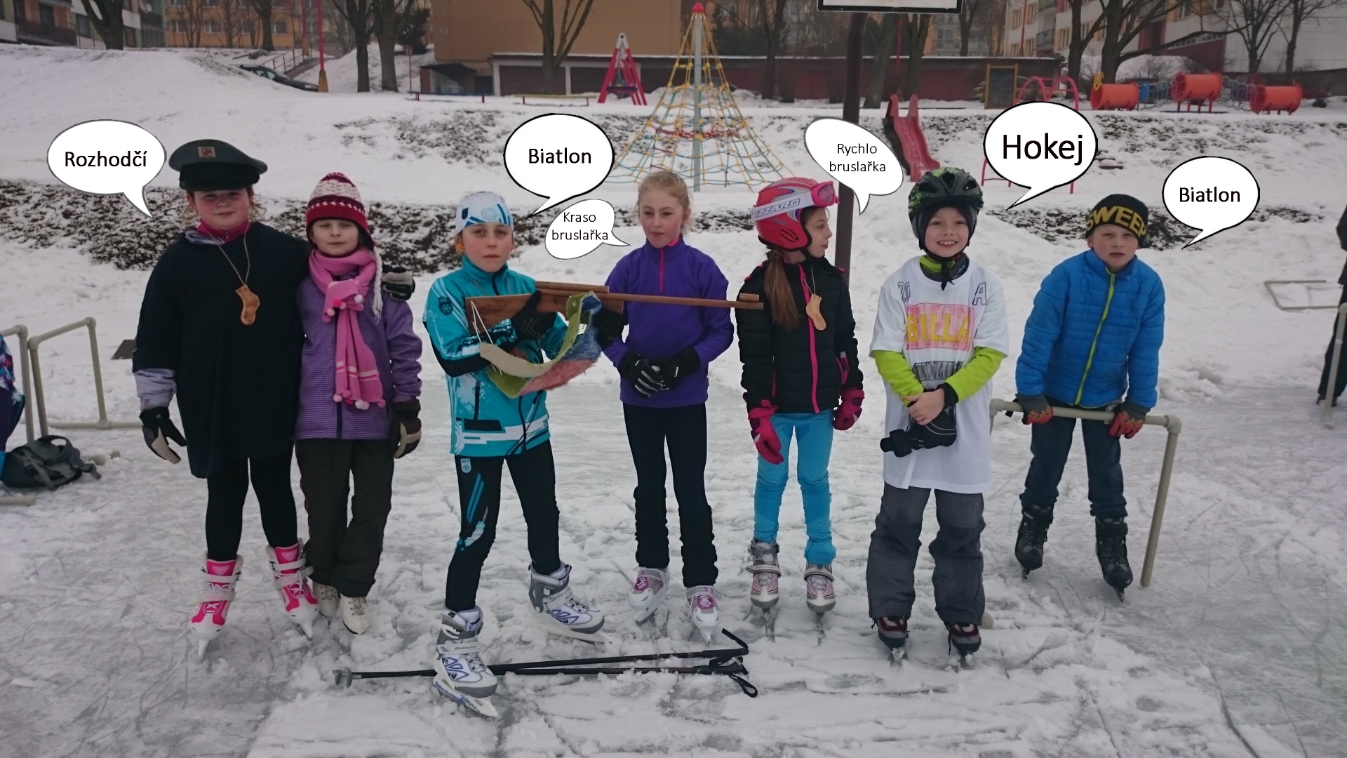 Z nedostatku jsme udělali přednost a díky sněhu na ledě jsme mohli vytvořit cestičky na závodní okruhy. Vznikly tak nové sporty, jak je biatlon na bruslích, štafety či orientační běh, ale zkusily jsme i ty, co na led patří: hokej, krasobruslení a rychlobruslení. Děti byly vystrojeny k nepoznání od originálních sportovců, vše měly dotažené do takových detailů, jakými byli sponzoři na dresech nebo sportovní pušky s dalekohledy. Děkuji všem za krásné odpoledne a doufám, že se příště zúčastní i ti, kteří z jakéhokoliv důvodu letos nemohli.