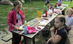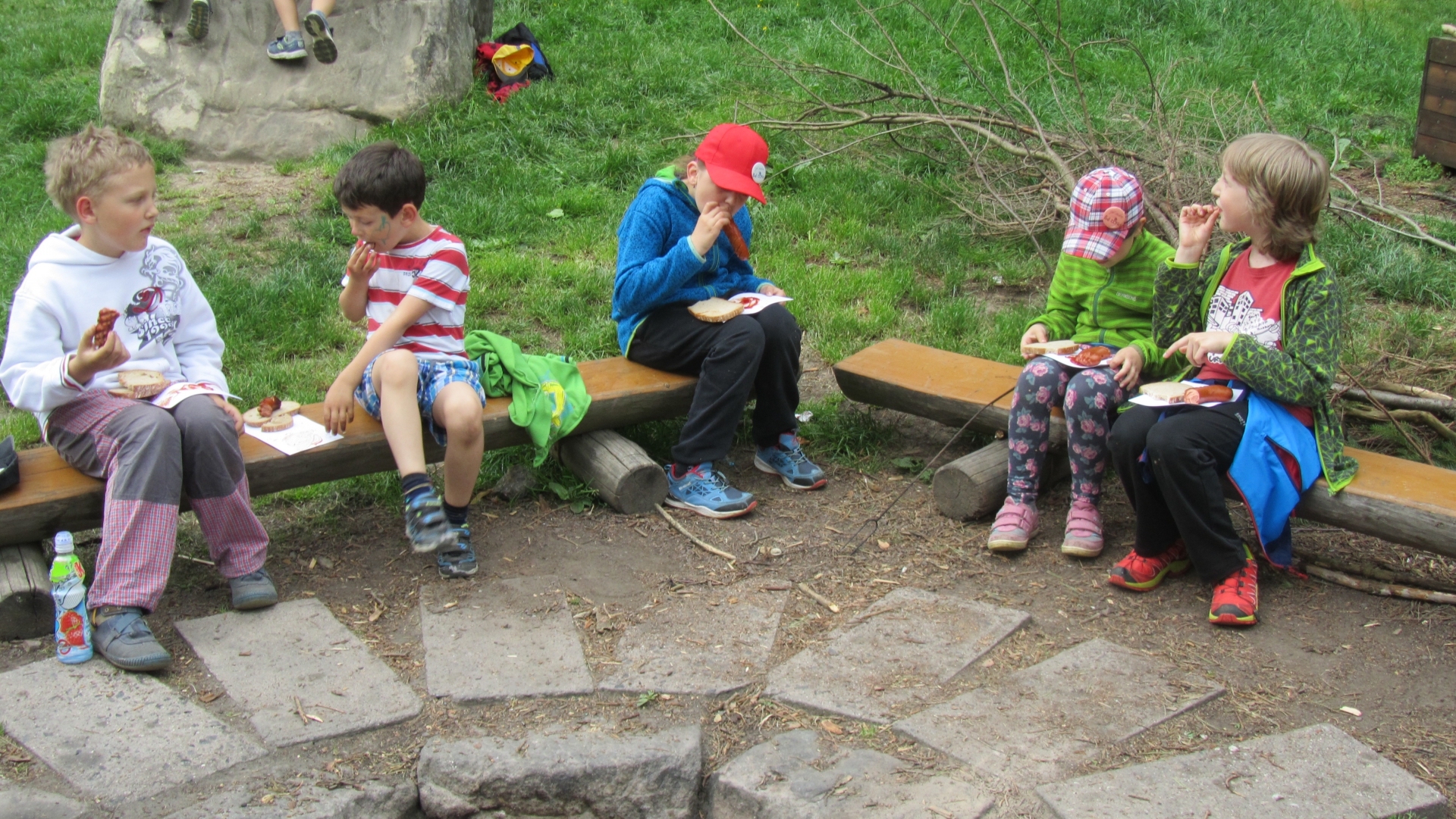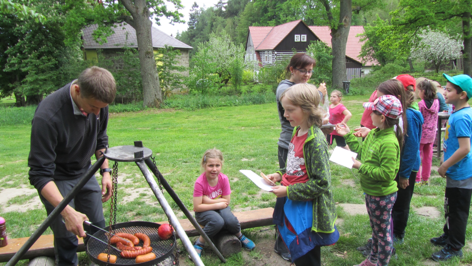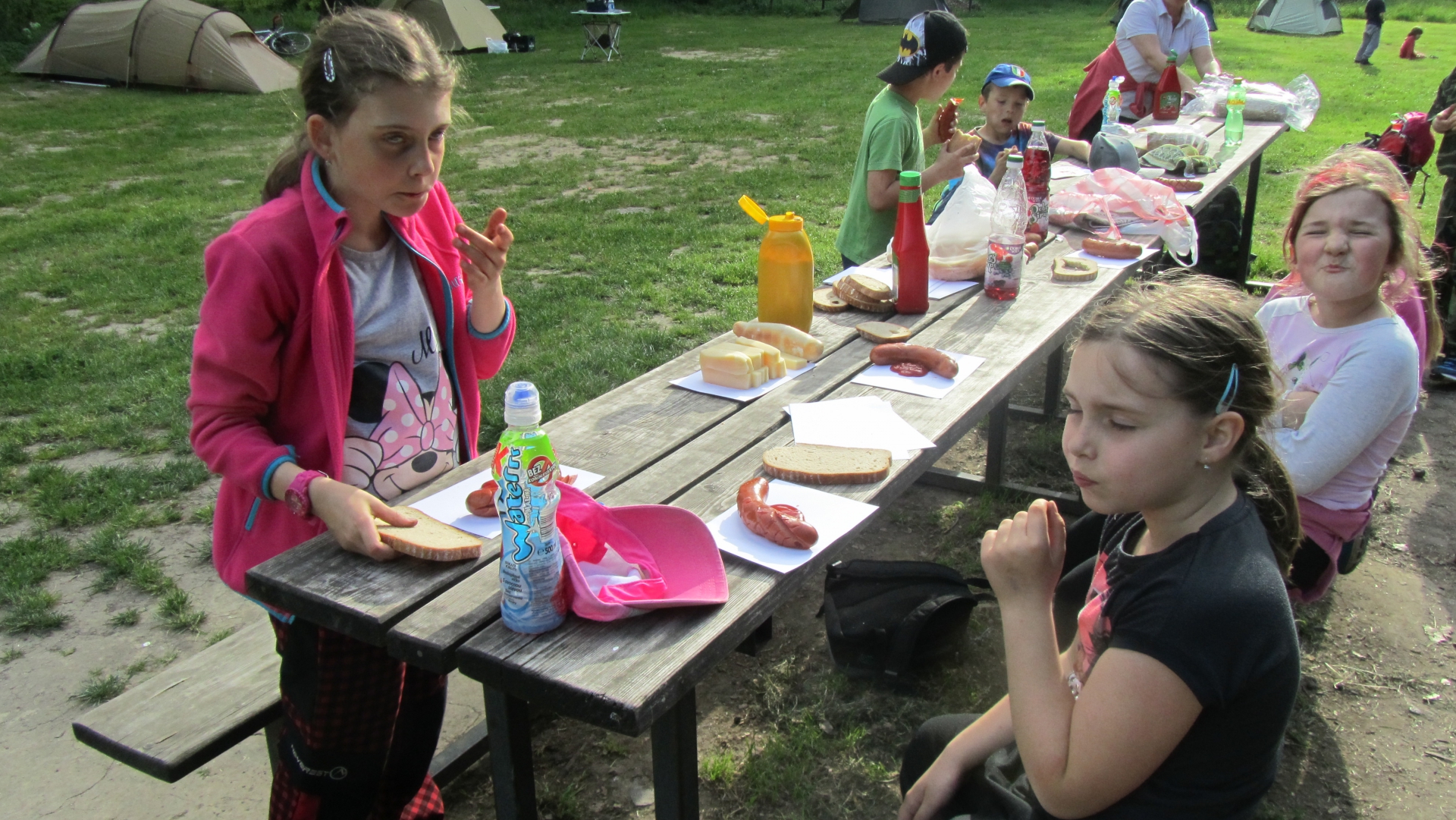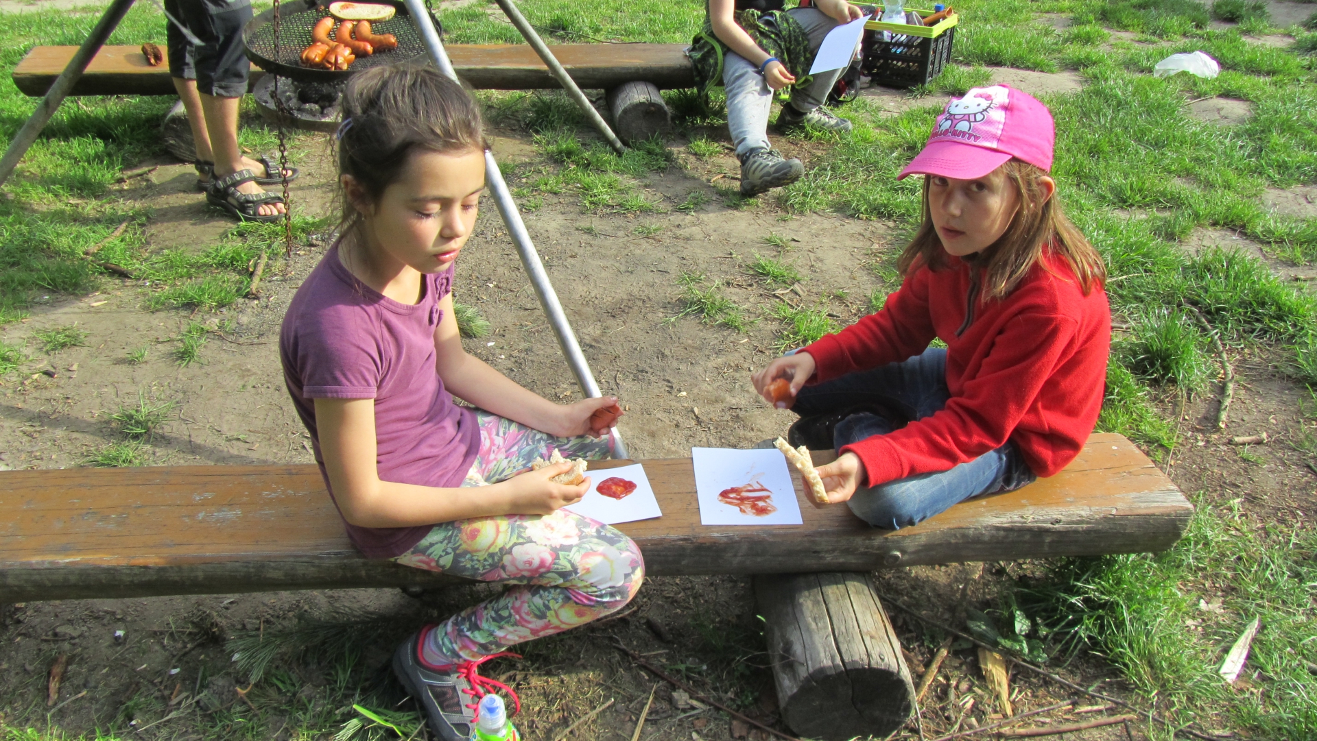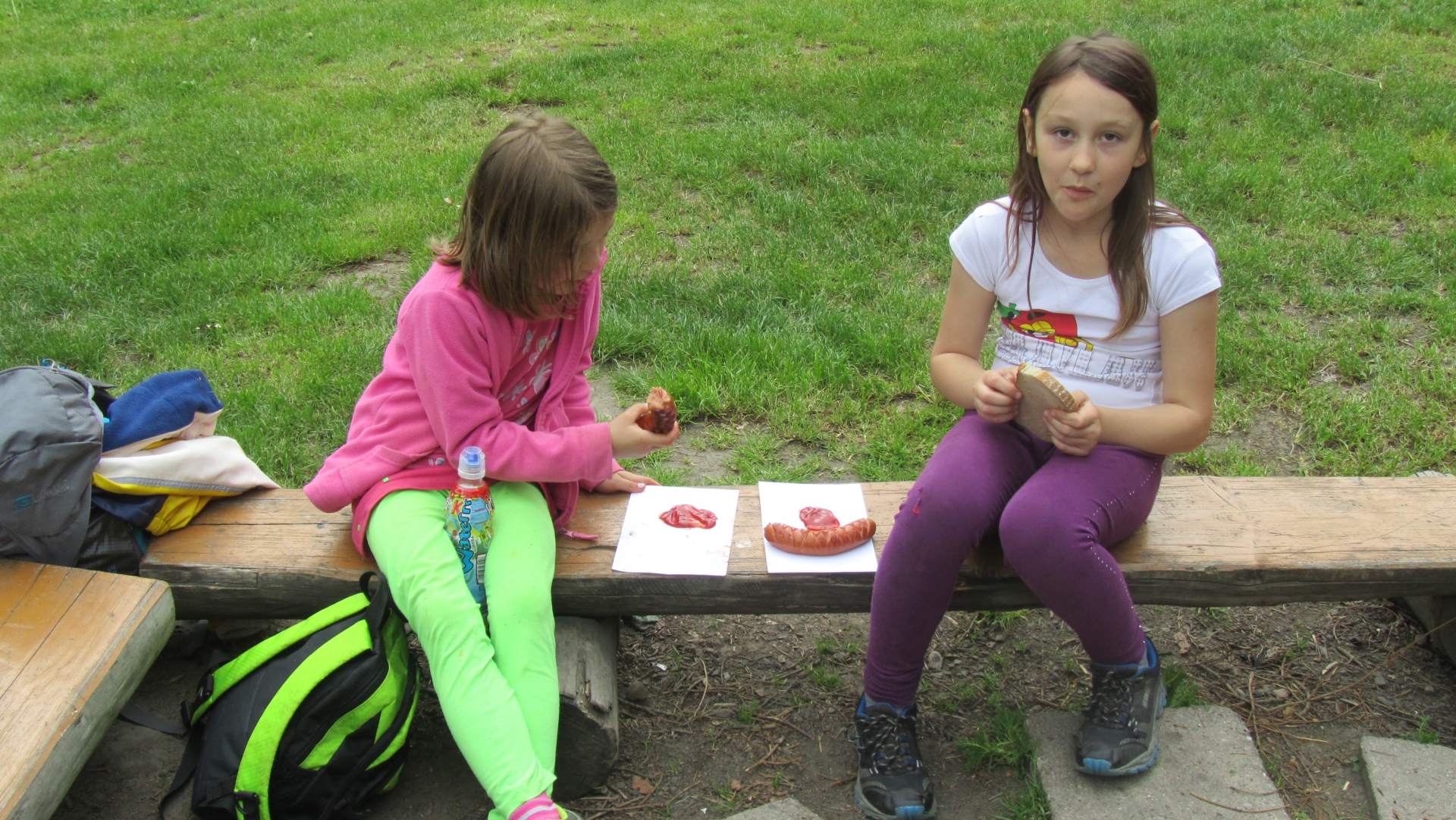 Kolem páté už byli všichni u ohniště. Každý dostal opečený párek s hořčicí či kečupem a pití. Většina měla i nějaké ty dobroty v batůžku. Po dobré večeři jsme vyrazili po skupinkách pěšky do školy.