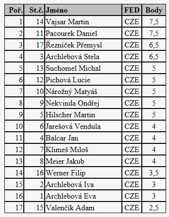 Ve výsledkové listině se projevilo, kdo se šachem začíná a kdo se mu jíž nějaký ten pátek věnuje - i tak proběhl velmi zajímavý turnaj, který pomohl našim žákům v další cestě s hrou na 64 polích. Velké poděkování všem za účast a předváděnou hru, gratulace vítězům a přání všem, aby se této královské hře věnovali i nadále !